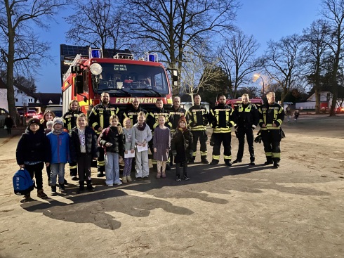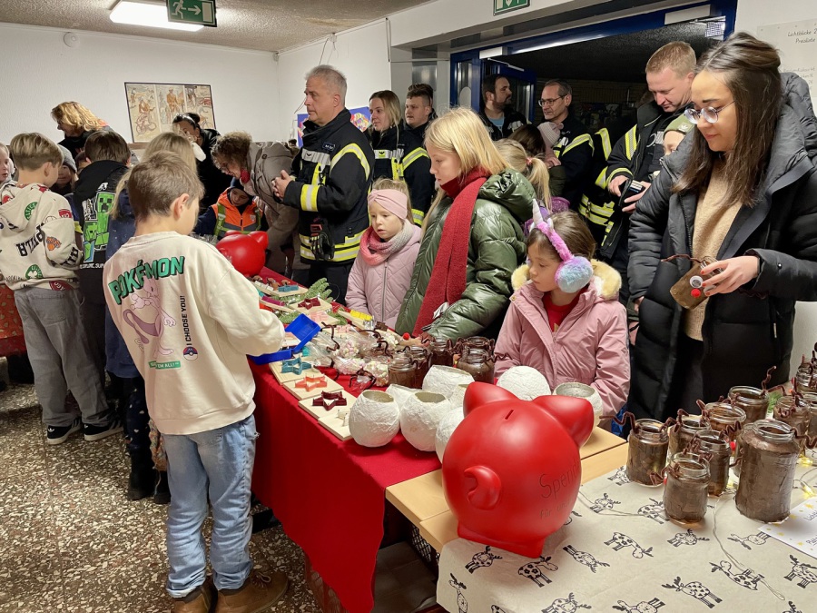 Traditionell backen alle Klassen in der Vorweihnachtszeit mit Unterstützung von vielen fleißigen Eltern Kekse für den „Eigengebrauch“ in der Vorweihnachtszeit. Jede Klasse spendet einen Teil dieser Kekse für den Verkauf vor Weihnachten an Mitschüler, Eltern und Großeltern …. und an die örtliche Feuerwehr. Unsere Kinder staunten nicht schlecht, als am Mittwochmorgen eine „Abordnung“ der Löscheinheit Rünthe mit eingeschaltetem Blaulicht auf den Schulhof einbog. Um Löscharbeiten ging es nicht, aber wie schon im letzten Jahr waren einige Mitglieder der Freiwilligen Feuerwehr angerückt,um selbstgebackene Plätzchen und gebastelte kleine Weihnachtsgeschenke zu kaufen.